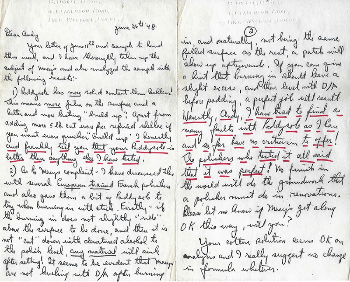 He collaborated with chemists to formulate the perfect padding lacquer, and after much trial and error, Paddysole (original European generic name) was created. Samples of his proprietary formula were sent to furniture and fine wood finishers in England and France. After our grandfather suddenly passed away, we discovered handwritten letters between he and esteemed polishers dated 1948. They all agreed his paddysole was the “best they had ever used”. As Paddysole’s popularity grew, he changed the name to 77 Lubricite™, due to the lustrous finish it achieves. The number 77 represents “lucky in life” and the French word lubricité translates in English to “lustfulness”.